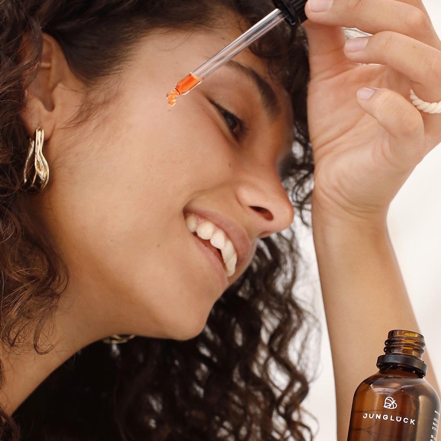 Gib nach der Gesichtsreinigung 2-3 Tropfen des Hagebuttenkernöls mit der Pipette in deine Handflächen und massiere es in die Gesichtshaut ein. Wenn du deine Haut vor der Anwendung leicht anfeuchtest, kann sie das Öl noch besser aufnehmen.